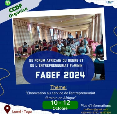 Nous sommes ravis de vous annoncer le 2e Forum Africain du Genre et de l'Entrepreneuriat Féminin (FAGEF), un événement dédié à la promotion de l'entrepreneuriat féminin en Afrique. Cette année, le FAGEF se tiendra à Lomé, au Togo, du 10 au 12 octobre 2024.